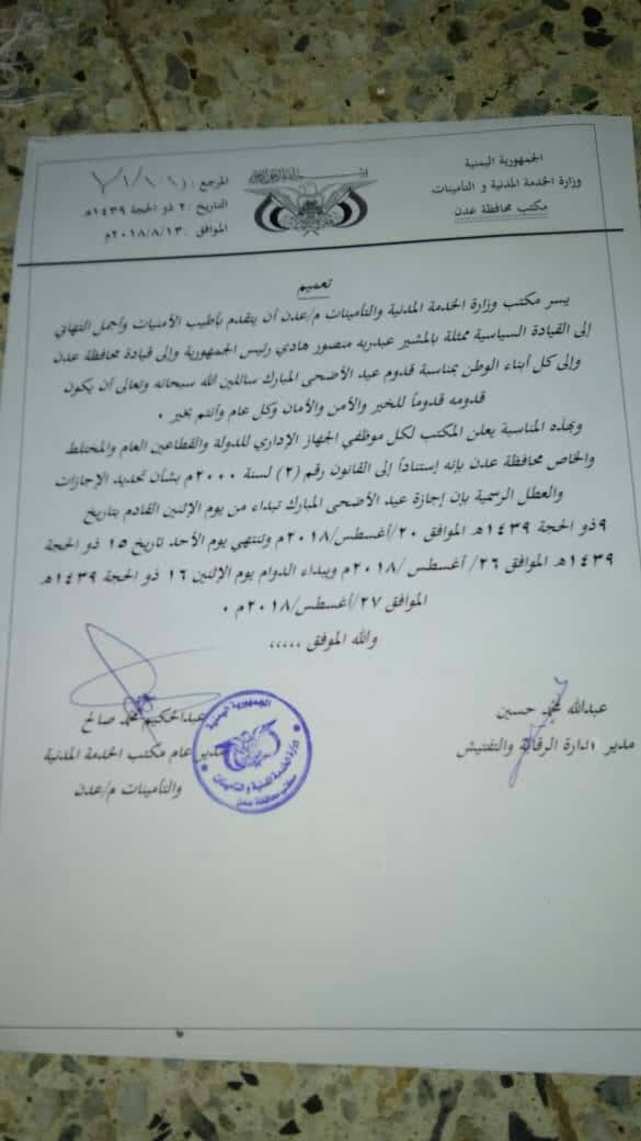نوه مكتب وزارة الخدمة المدنية والتأمينات بعدن بأن يوم غد (الأثنين) أول أيام الدوام الرسمي للقطاعين العام والمختلط بالمحافظة حسب القانون اليمني الخاص بالعطل والاجازات.
