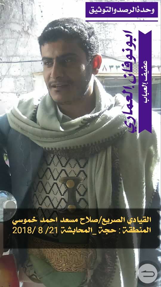 وأفادت مصادر عسكرية في المنطقة الخامسة إلى أن خموسي كان يعمل مشرفاً للميليشيات في مديرية المحابشة.