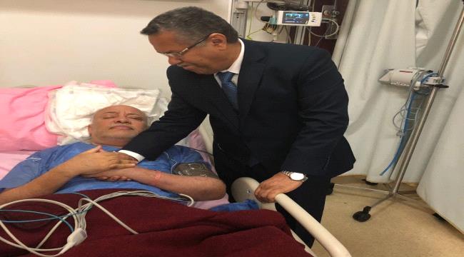 وفي الصورة يظهر وقوف بن دغر إلى جانب سرير بن عُمر الذي لم يقو على الجلوس؛ ما يعني أن حالة الوزير صعبة للغاية .
