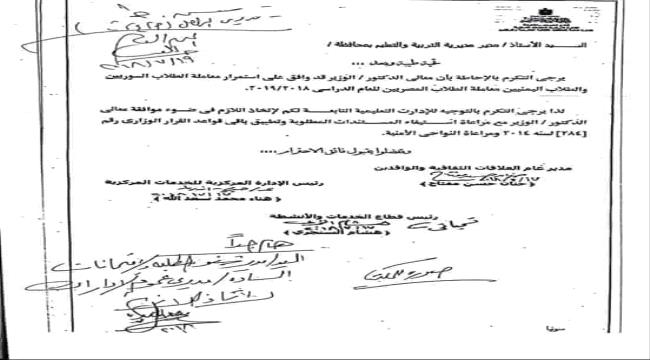 أقرت وزارة التربية والتعليم المصرية معاملة الطلاب اليمنيين مثل المصريين للعام الدراسي 2018/2019م، بحسب وثيقة متدوالة.