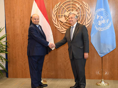 من جانبه عبر الأمين العام للأمم المتحدة انطونيو غوتيرس سروره بلقاء فخامة الرئيس والوفد المرافق له.. مشيدا بمواقف الرئيس الدائمة نحو السلام وخطواته العملية في هذا الإطار، مؤكداً ان الامم المتحدة ستبذل كل ما أمكن لدعم جهود السلام لمصلحة الشعب اليمني واستعدادها التام لمضاعفة العمل مع الحكومة لدعم جهود السلام وفي تسهيل وتذليل الكثير من التحديات التي تواجه العملية السياسية في اليمن.