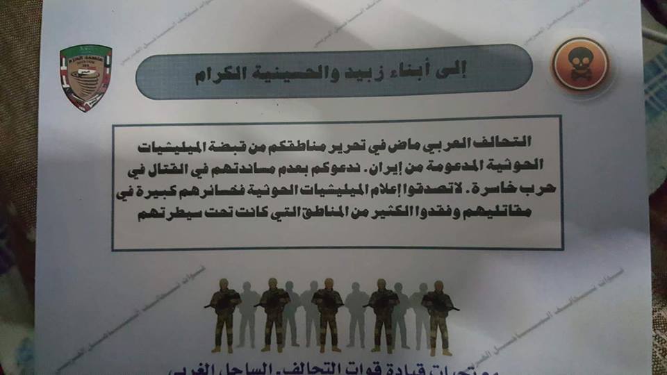 اسقطت طائرات للتحالف العربي على سكان مدينة الحديدة ثلاث نداءات هامة ، حثت فيها في النداء الأول ابناء مدينة الحديدة الى عدم الإنصياع لدعوات مليشيا الحوثي للقتال في صفوفهم .