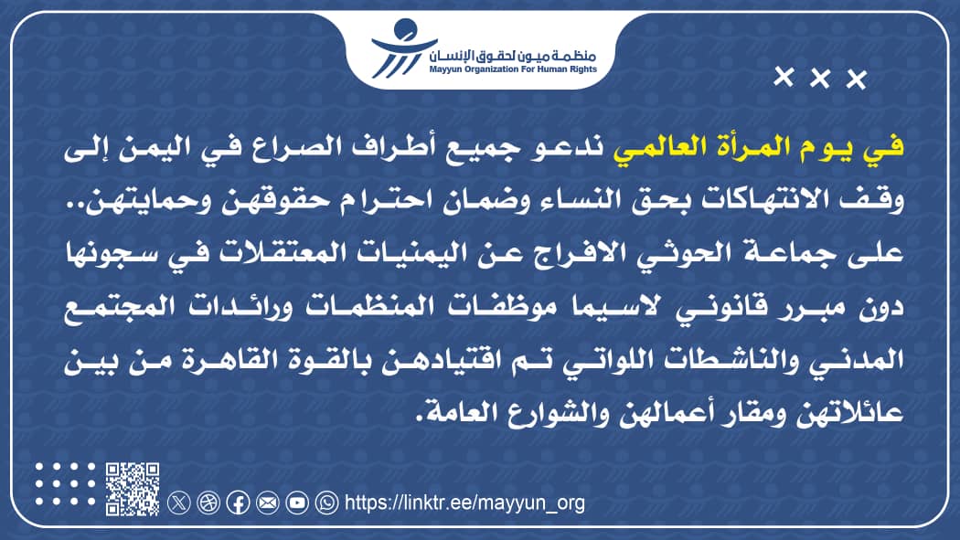كما ناشد المجتمع الدولي بتحمل مسؤولياته ازاء الانتهاكات الفظيعة التي ترقى الى جرائم حرب في المناطق الخاضعة بالقوة لسيطرة المليشيات، بما في ذلك استمرار معاناة عشرات الالاف من مواطنينا المهجرين، والمحتجزين والمخطوفين، والمخفيين، والمعتقلين، بينهم صحفيون ونشطاء، وفنانون، وعمال اغاثة، ورهائن من مختلف الاعمار.