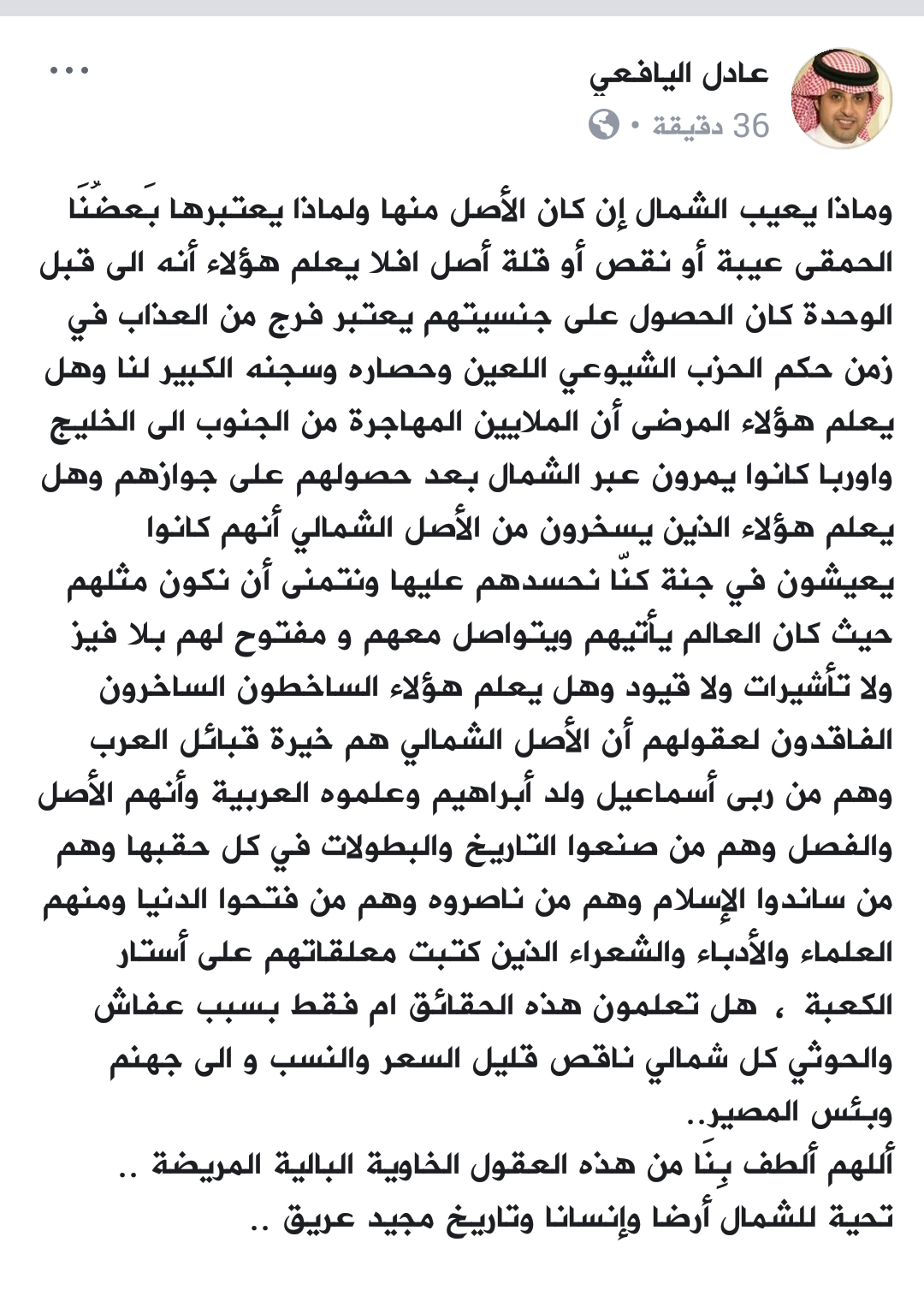 ويضيف اليافعي افلا يعلم هؤلاء أنه الى قبل الوحدة كان الحصول على جنسيتهم يعتبر فرج من العذاب في زمن حكم الحزب الشيوعي اللعين وحصاره وسجنه الكبير لنا . واشار مذيع قناتي العربية والحدث تابع منشوره هناعدن وهل يعلم هؤلاء المرضى أن الملايين المهاجرة من الجنوب الى الخليج واوربا كانوا يمرون عبر الشمال بعد حصولهم على جوازهم وهل يعلم هؤلاء الذين يسخرون من الأصل الشمالي أنهم كانوا يعيشون في جنة كنّا نحسدهم عليها ونتمنى أن نكون مثلهم حيث كان العالم يأتيهم ويتواصل معهم و مفتوح لهم بلا فيز ولا تأشيرات ولا قيود. وواصل بالقول وهل يعلم هؤلاء الساخطون الساخرون الفاقدون لعقولهم أن الأصل الشمالي هم خيرة قبائل العرب وهم من ربى أسماعيل ولد أبراهيم وعلموه العربية وأنهم الأصل والفصل وهم من صنعوا التاريخ والبطولات في كل حقبها وهم من ساندوا الإسلام وهم من ناصروه وهم من فتحوا الدنيا ومنهم العلماء والأدباء والشعراء الذين كتبت معلقاتهم على أستار الكعبة. وأضاف قائلا هل تعلمون هذه الحقائق ام فقط بسبب عفاش والحوثي كل شمالي ناقص قليل السعر والنسب و الى جهنم وبئس المصير.. مضيفا أللهم ألطف بِنَا من هذه العقول الخاوية البالية المريضة .. تحية للشمال أرضا وإنسانا وتاريخ مجيد عريق ..
