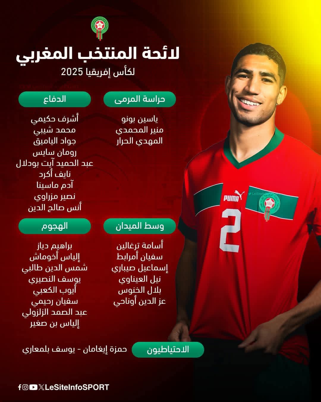 أقر اليوم الاتحاد المغربي لكرة القدم تشكيلة المنتخب الوطني المغربي الذي سيشارك في نهائيات كأس امم افريقيا.. وهي موضحة في الانفوجرافيك المرفق في هذا الخبر.