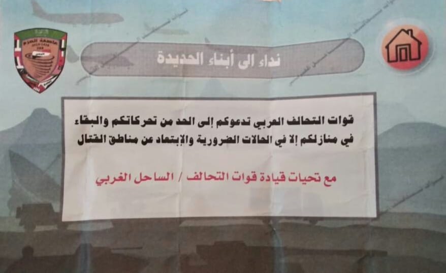 وقالت قوات التحالف على الأهالي الإبتعاد عن مناطق القتال والإشتباكات مع المليشيات الحوثية الإيرانية في محافظة الحديدة حفاظا على سلامة أرواحهم .