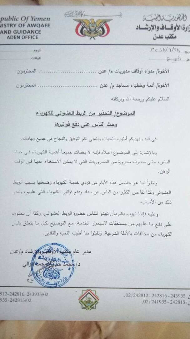 دعت إدارة مكتب الأوقاف والإرشاد في العاصمة عدن أئمة وخطباء المساجد على حث المواطنين في دفع الفواتير والتحذير من الربط العشوائي.