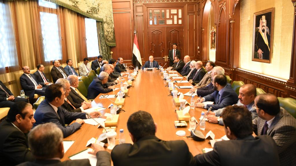 رأس فخامة الرئيس عبدربه منصور هادي رئيس الجمهورية وبحضور نائبه الفريق الركن علي محسن صالح ورئيس الوزراء الدكتور معين عبدالملك اجتماعاً مشتركاً لمستشارية ورئيس وأعضاء الوفد المشارك في مشاورات السلام التي عقدت في السويد برعاية اممية.