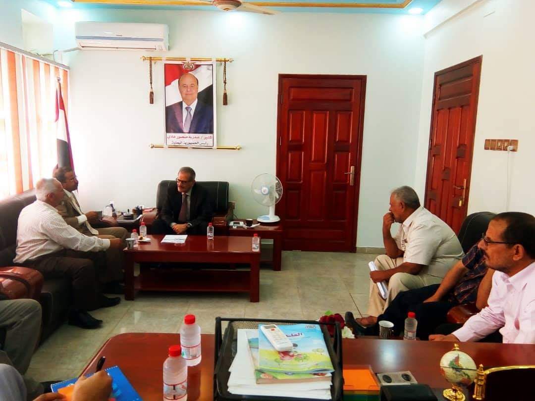 ورحب معاليه بوفد محافظة البيضاء المرافق لمحافظها السوادي، حيث اطلع محافظ البيضاء معالي الوزير على ابرز الصعوبات التي تواجه المحافظة خاصة في الجانب التربوي والتعليمي، كون المحافظة يقبع جزء منها تحت سيطرة الانقلابيين الحوثيين كما اشار السوادي بان المحافظة تحتاج الى كثير من المشاريع الخاصة بالتربية اضافة الى رواتب المعلمين ، والمعلمين النازحين.