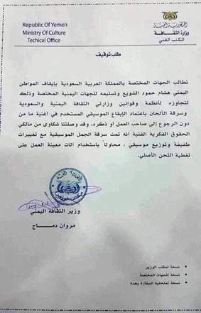 الأخوة الأعزاء... شاهدت ورقة منسوبة لوزارة الثقافة تتضمن طلب توقيف الاخ هشام الشويع. .وطبعا من الواضح في الصياغة والشكل أنها ملفقة وربما رأى فيها أحد الأخوة أنها طرفة او نكتة.. وبالتأكيد ليس وظيفة وزارة الثقافة ان تطلب إيقاف أحد.. كما أن تقليد الفنانيين مهما كان رأينا فيمن يقلد لا يستوجب المسائلة ولا المطالبة بالايقاف ..أعرف أن الأمر قد يبدو نكتة او مزاح وأن جميع من سيطلع عليها سيعرف ذلك بسهولة ..تحياتي للجميع