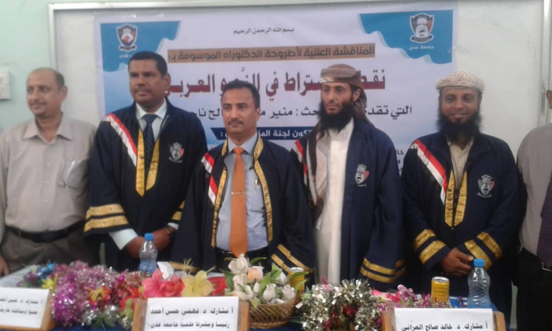 جرت في صباح يومنا هذا الثلاثاء الموافق 15/ 1/ 2019 بكلية الآداب، جامعة عدن، مناقشة علنية لأطروحة الدكتوراه الموسومة ب: (نقض الاشتراط في النحو العربي)، للطالب: منير محمد صالح الضنبري. وتكونت اللجنة العلمية من: