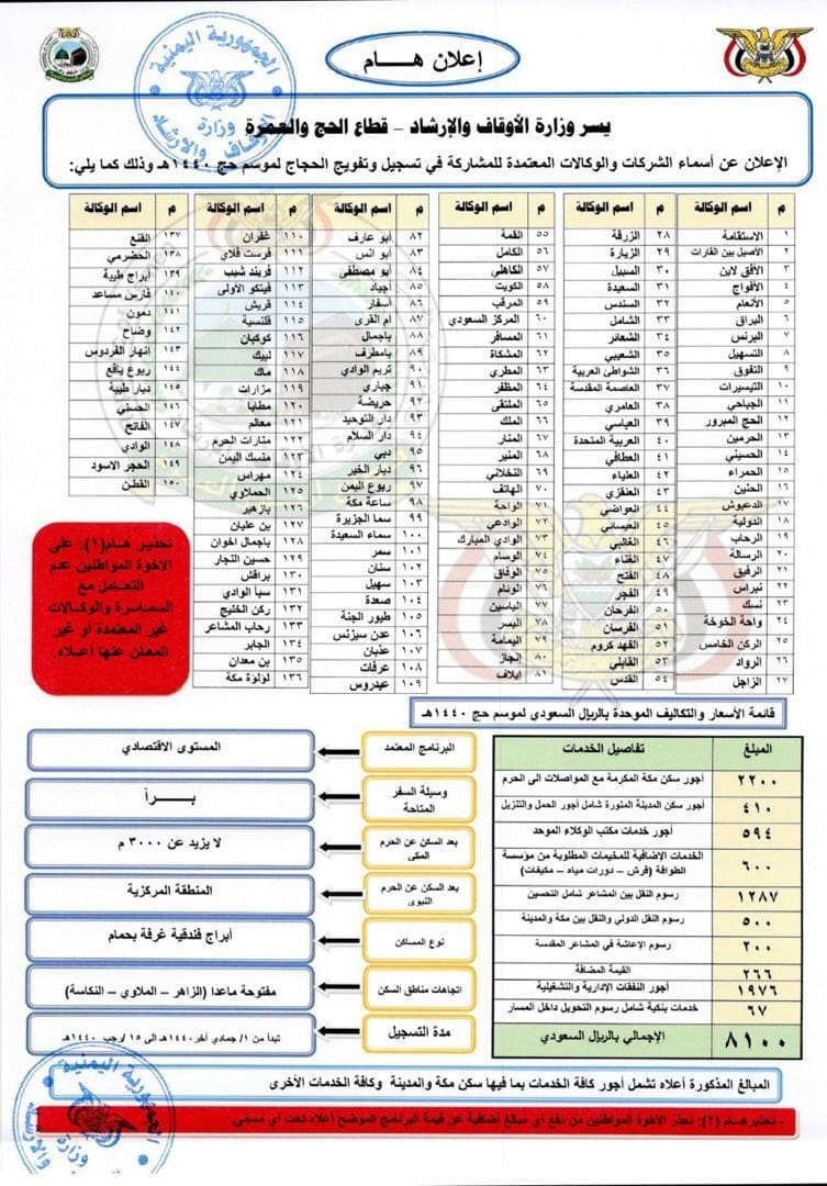 وشمل الإعلان قائمة بأسماء وكالات الحج والعمرة المعتمدة لتفويج حجاج الجمهورية اليمنية للموسم القادم 1440هـ وعددها 150 وكالة.