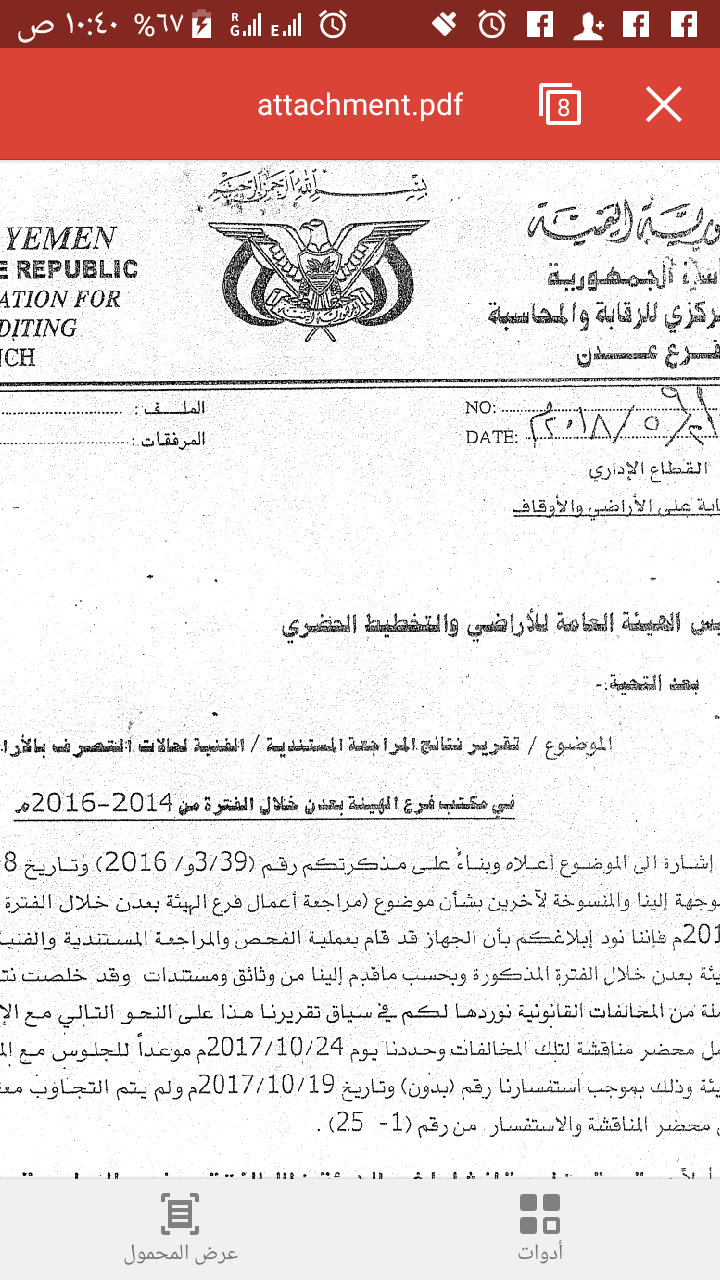 أصدر الجهاز المركزي للرقابة والمحاسبة مؤخرًا تقريرًا تضمن نتائج المراجعة المستندية والفنية لحالات التصرف بالأراضي خلال الأعوام الماضية .
