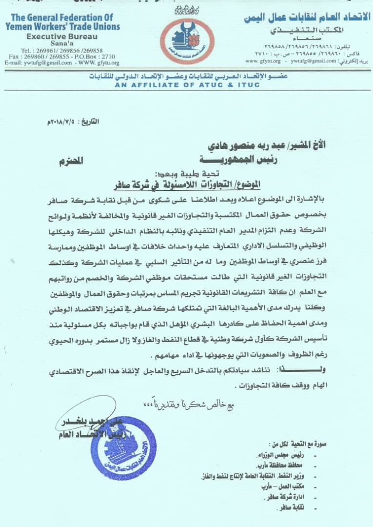 وفي هذا السياق وجه الاتحاد العام مذكرة إلى فخامة رئيس الجمهورية المشير عبد ربه منصور هادي بخصوص التجاوزات اللامسئولة في شركة صافر..مؤكدًا على تجريم المساس بحقوق الموظفين و الالتزام بلوائح و انظمة الشركة و القوانين النافذة، رافضا كافة الممارسات العنصرية غير المسئولة من المدير العام التنفيذي و نائبه، و ناشد الاتحاد فخامة رئيس الجمهوربة سرعة التدخل و انقاذ الشركة من الانهيار.
