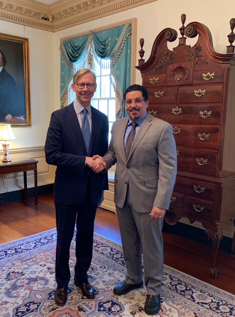 وقال هوك، خلال لقائه سفير اليمن لدى أميركا، أحمد بن مبارك، إن الولايات المتحدة "ستعمل عن قرب مع الحكومة (اليمنية) للقضاء على هذا التهديد الذي يمثله نظام طهران الإرهابي وأذرعه في المنطقة".