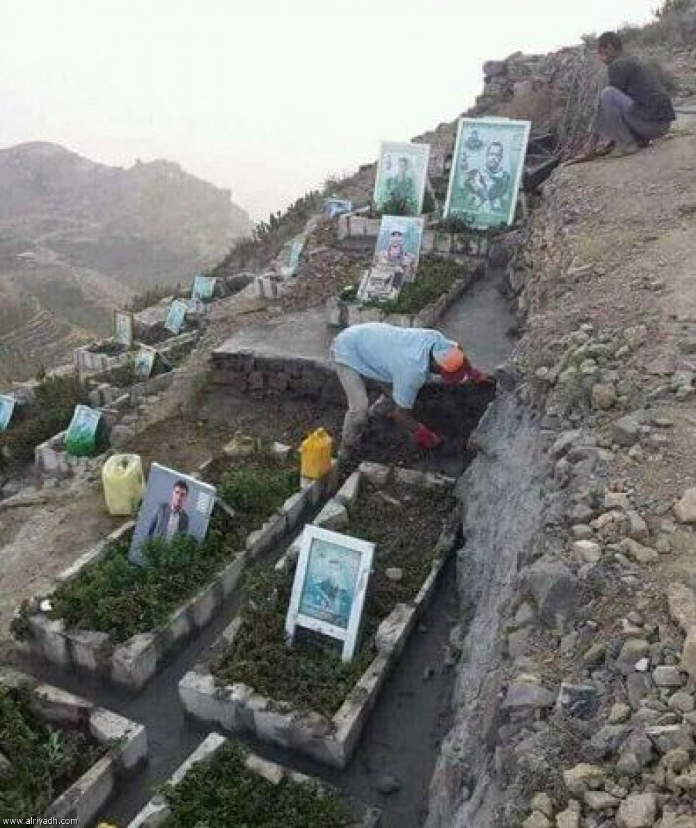ويظهر في الصور كيف حوّلت المليشيات الانقلابية الحوثية المزارع في محافظة حجه لمقابر لقتلاها الذين سقطوا في المعارك الدائرة حاليا في كافة الجبهات وهزيمتهم فيها .