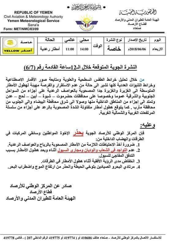حذرت خدمات الأرصاد الجوية اليمنية في بيانا أصدرته اليوم وتحصل "الاتحاد نت" على نسحة منه ، جاء فيه توقعات الطقس خلال 12 ساعة القادمة موضحة للمواطنين أنه من خلال تحليل خرائط الطقس السطحية والعلوية ومتابعة صور الأقمار الإصطناعية وخرائط التنبؤات العددية كلها تشير إلى حالة من عدم الإستقرار وان الفرصة مهيئة لهطول أمطار متوسطة الى الغزيرة والغزيرة جدا المصحوبة بالعواسف الرعدية .