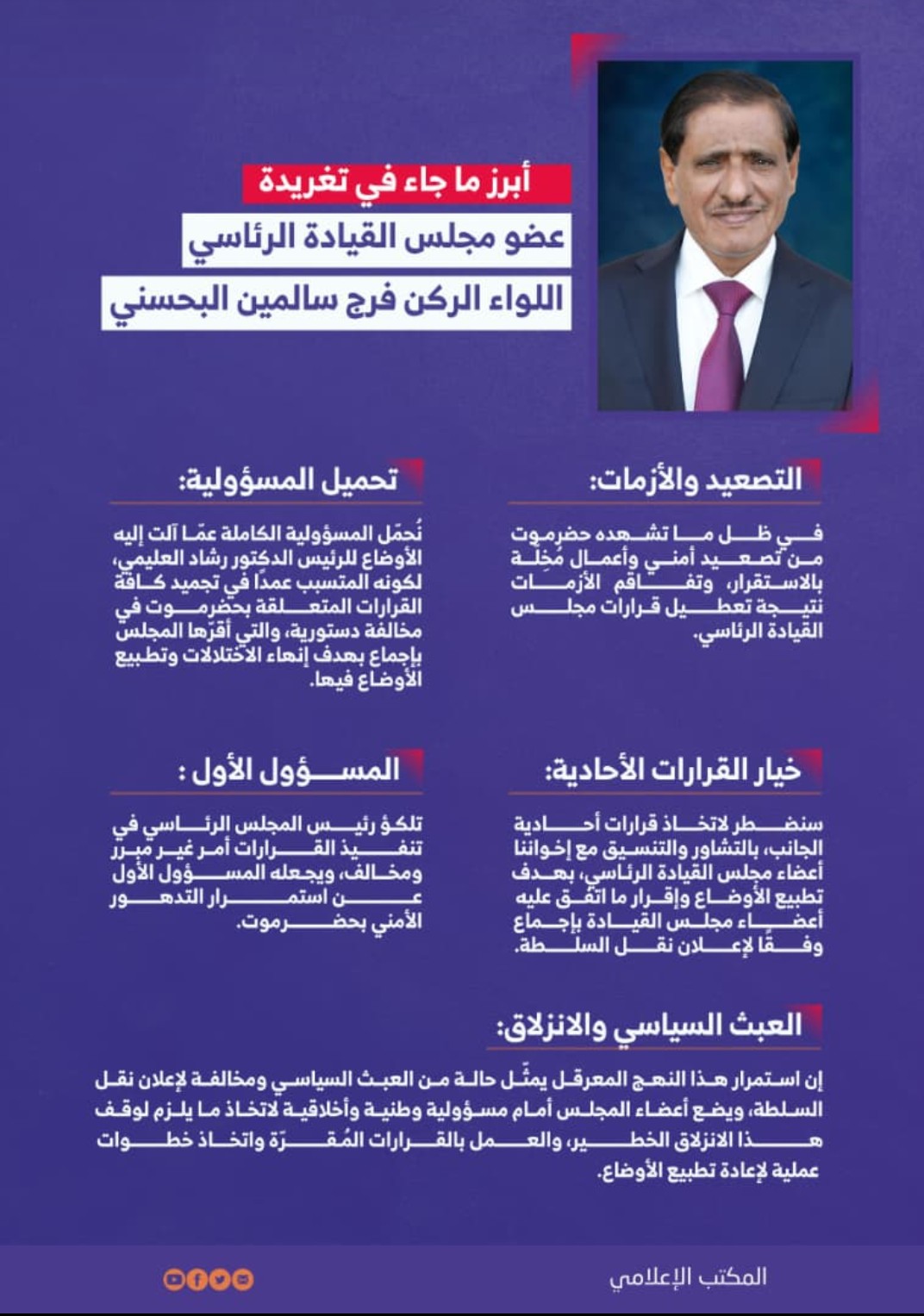 ولفت إلى أن المبادرات الإنسانية لقوات تحالف دعم الشرعية في اليمن تعكس حجم اهتمام التحالف بالإنسان اليمني وذلك للتخفيف من معاناته، فهو يضع شعار الحفاظ على الإنسان اليمني أولًا.