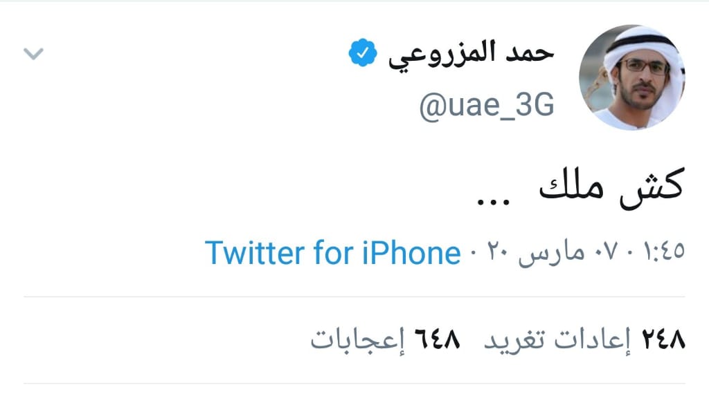 وتصدر ترند السعودية اسم " حمد المزروعي " اليوم السبت وذلك بعد ان غرد بكلمتين قال فيهم ( كش ملك ) وهو مااعتبره السعوديون إشارة الى نهاية حياة ملك المملكة العربية السعودية " الملك سلمان " وهو ما اثار حفيظة الشعب السعودي الذي اتهم المزروعي بانه الصديق العدو الذي يطعن السعودية من الخلف.